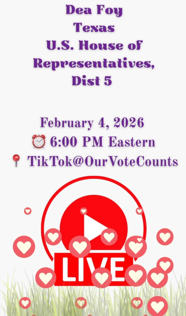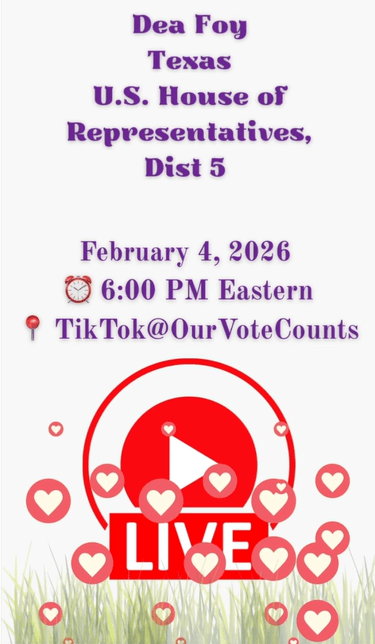 Save the date on your calendar for Wednesday, Feb 4 at 5pCST when Dea participates in a virtual town hall event hosted by Our Vote Counts, live on TikTok. See Promo for more details.